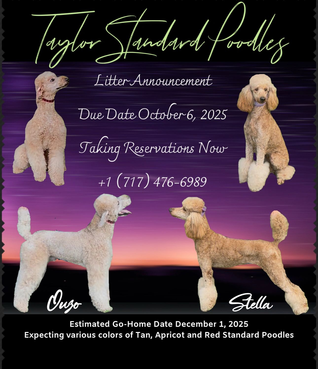 Ouzo & Stella are expecting pups on October 6, 2025. Reservations are currently open to reserve a pup from this litter. We are expecting various colors of tan, apricot and red standard poodles. Please call 1- (717) 476-6989 for more information.